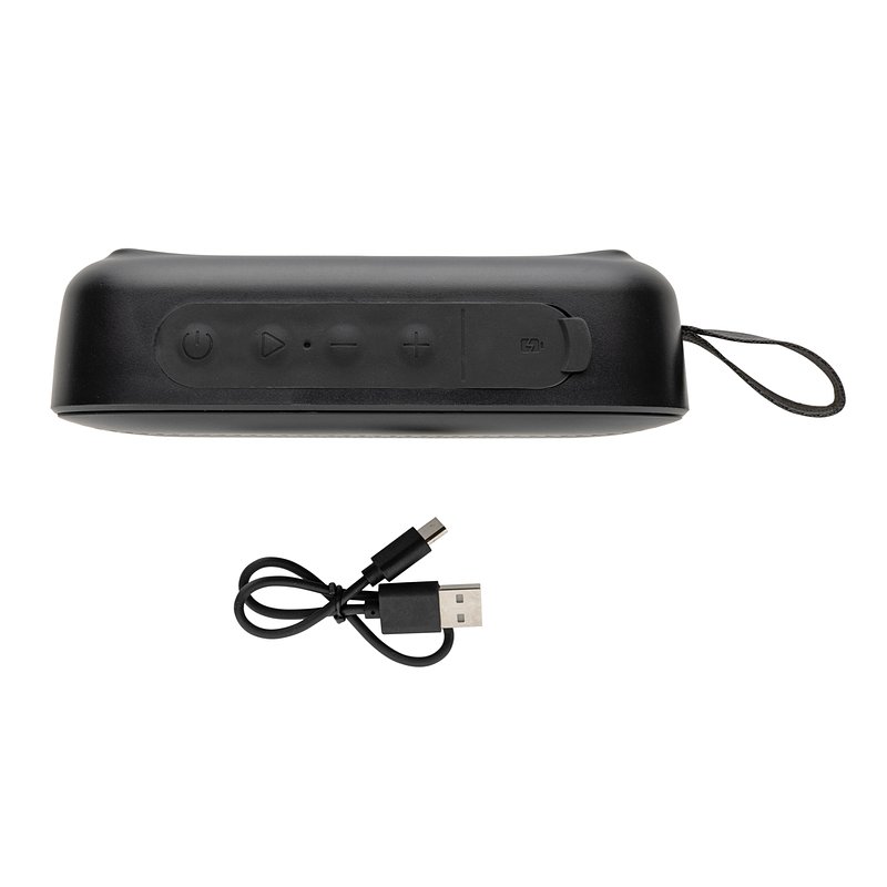 5W wireless speaker made from RCS (Recycled Claim Standard) certified recycled ABS. Total recycled content: 36% based on the total weight of the item. The RCS certification guarantees a fully certified supply chain of recycled materials. The speaker is equipped with a 1200 mAh battery to guarantee up to 6 hours of playback time and BT5.3 for a smooth connection and clear sound. Connection range of up to 10 meters. With microphone for answering calls. Presented in an FSC® mix box. Includes TPE charging cable certified by RCS as recycled. Item and accessories are 100% PVC free. IPX5 water resistant.