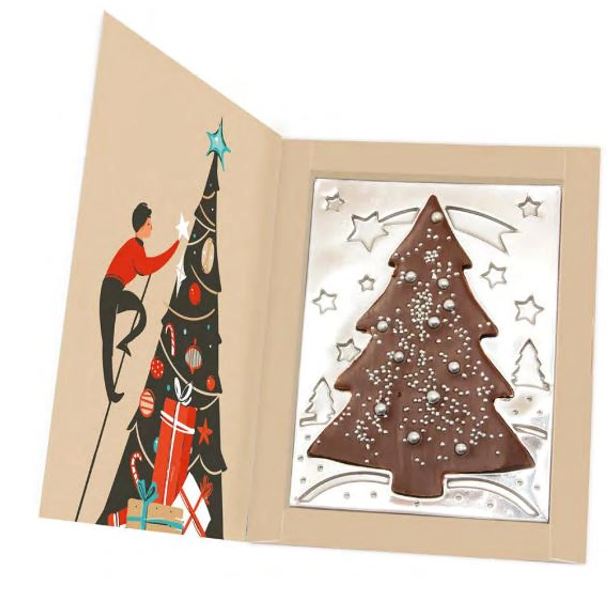 Gran árbol de Navidad hecho de chocolate belga con decoraciones de azúcar en varios sabores y colores.