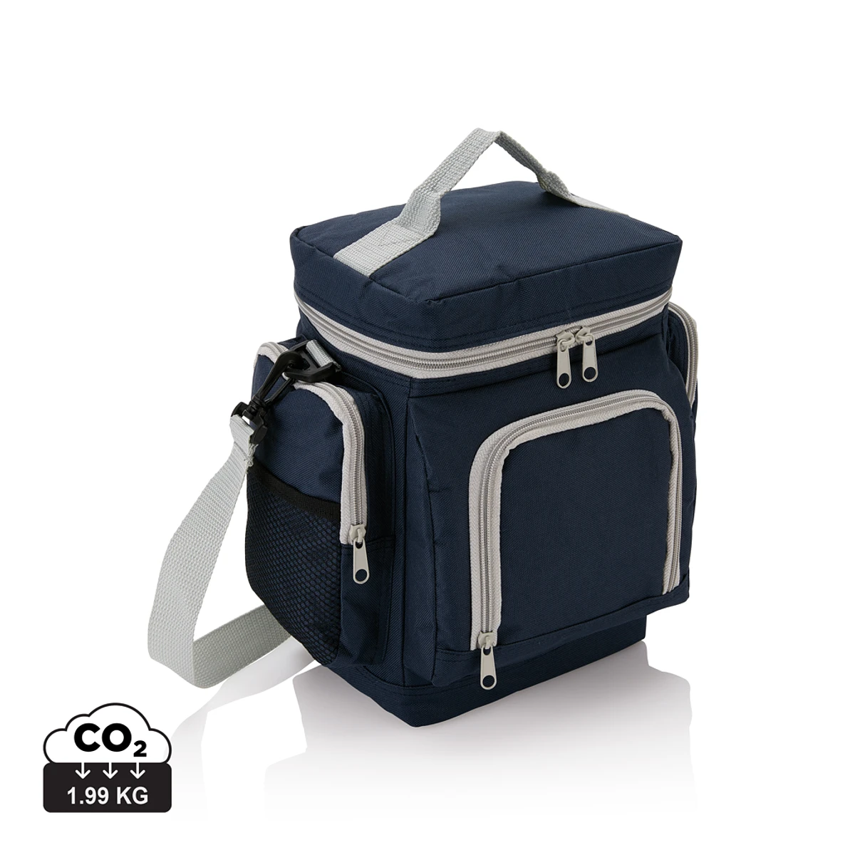 600D polyester cooler with multiple compartments and adjustable shoulder strap. PVC free.