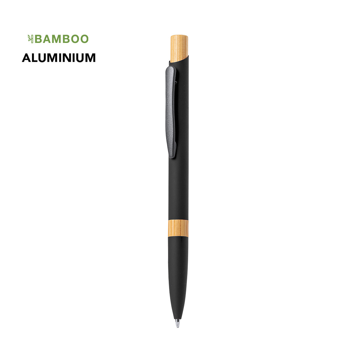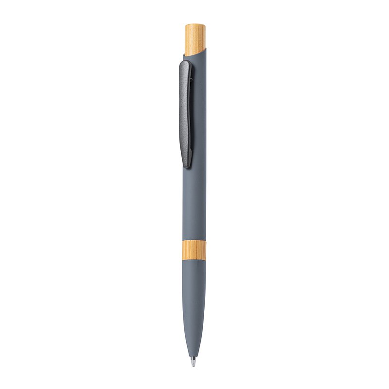 Elegant aluminum pen with push button mechanism. Body made of sturdy aluminum with a matte rubber finish and bamboo details, with a barrel in a wide range of distinctive colors. Metallic clip, jumbo refill and blue ink. Presented in an individual recycled bag. Materials such as bamboo encourage the use of natural raw materials, reducing pollutant emissions. It comes from a highly resistant and versatile plant, with fast growth and regeneration, making it an excellent alternative to the use of traditional wood.