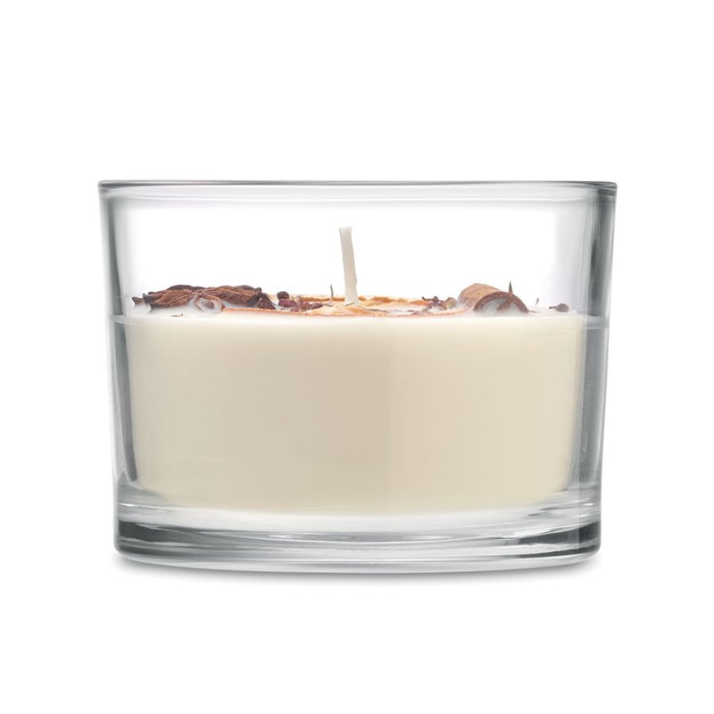Vela de cera vegetal con fragancia a canela y cítricos, con flores y frutos secos, en tarro de cristal. 300 gr. Tiempo de combustión: 50 horas.