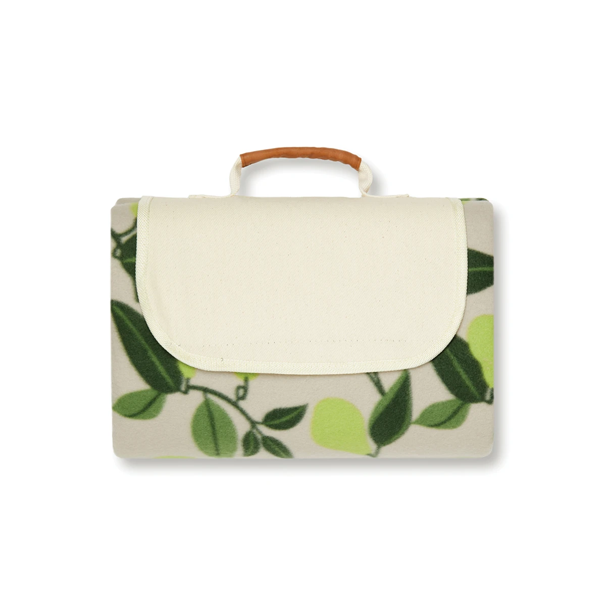 Picnic blanket in soft plush with cotton canvas and synthetic leather details. The fleece lining is made of 100% GRS certified RPET. The GRS certification guarantees a fully certified supply chain for recycled materials. The back is made of PEVA, which repels water. Smart construction makes it easy to fold and carry with you. Total recycled content: 56% based on the total weight of the item.