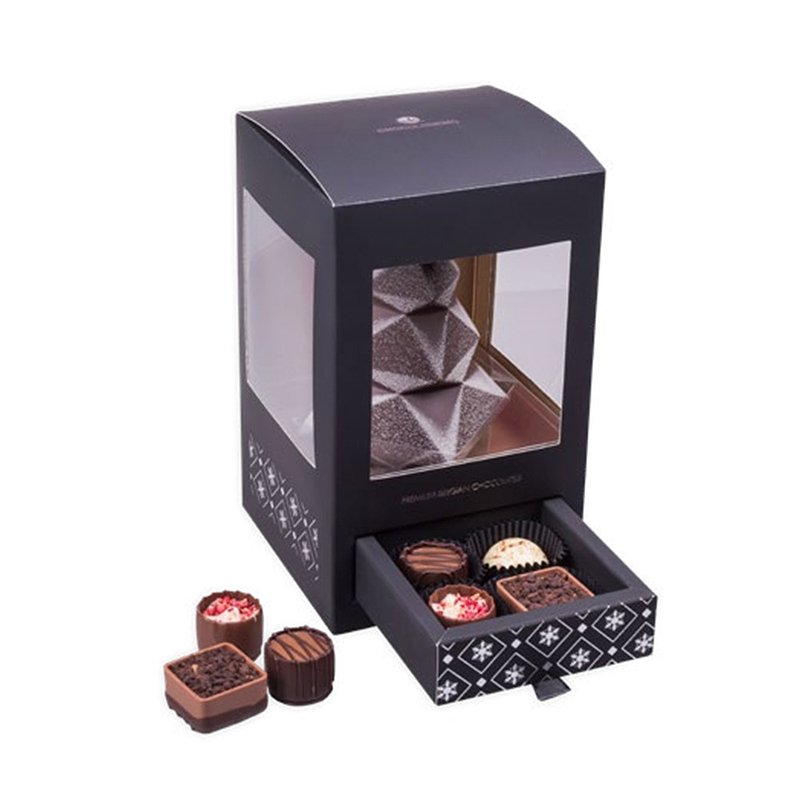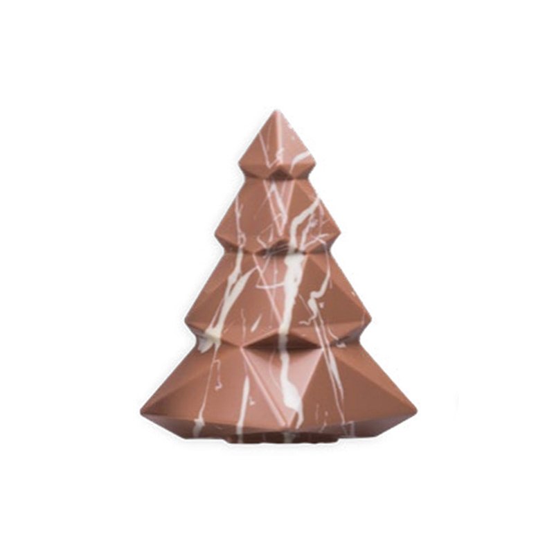 Impresionante árbol de Navidad de chocolate belga, presentado en estuche elegante. Posibilidad de escoger entre chocolate negro, blanco o con leche. 190x115x115mm