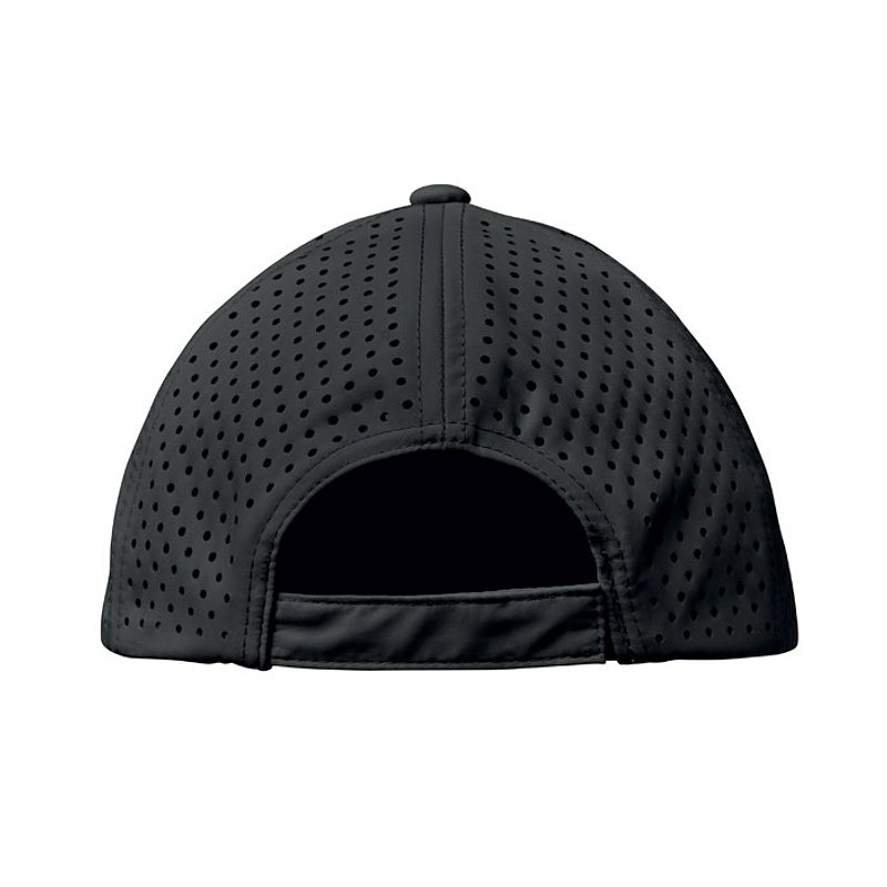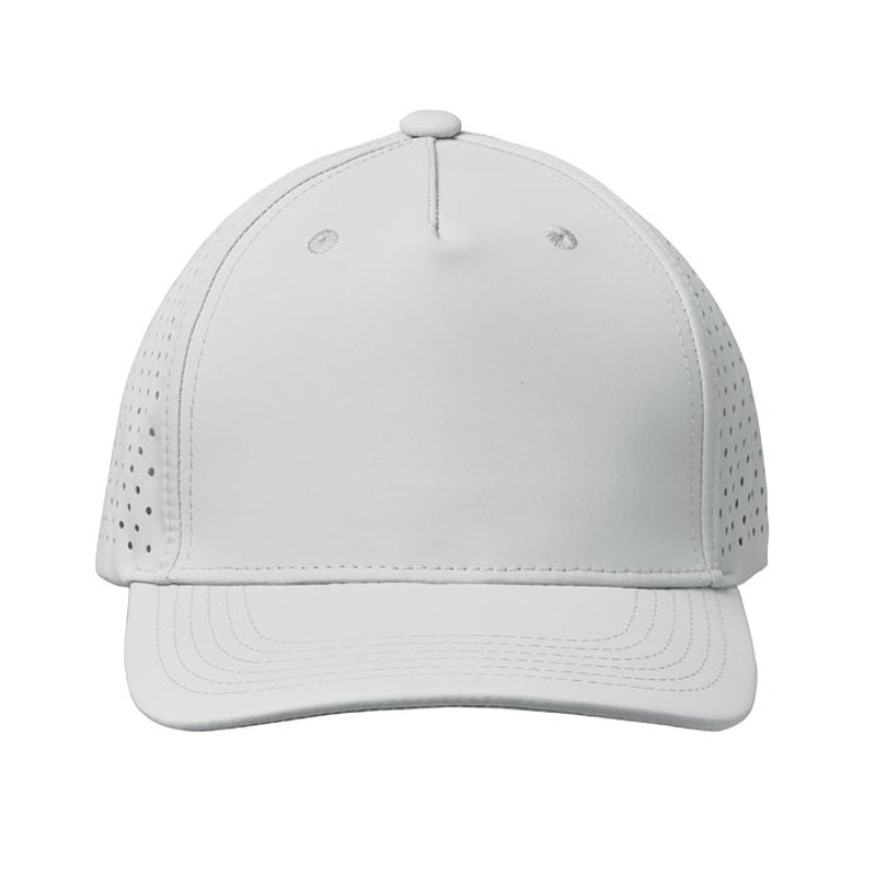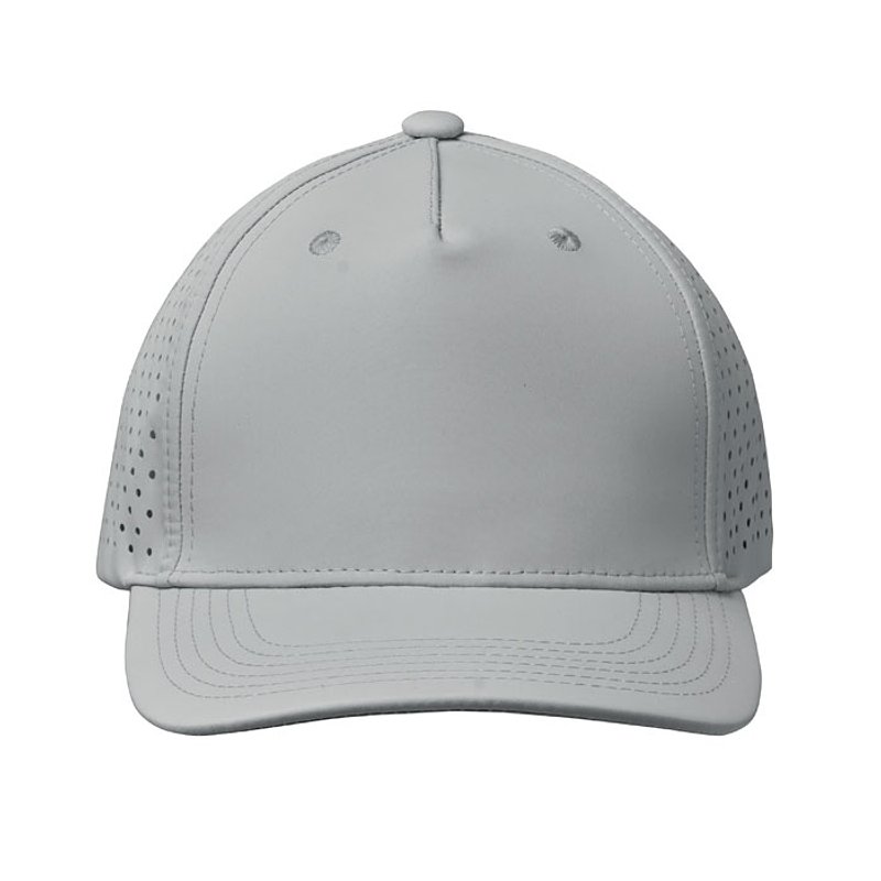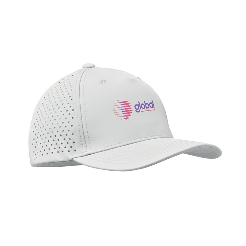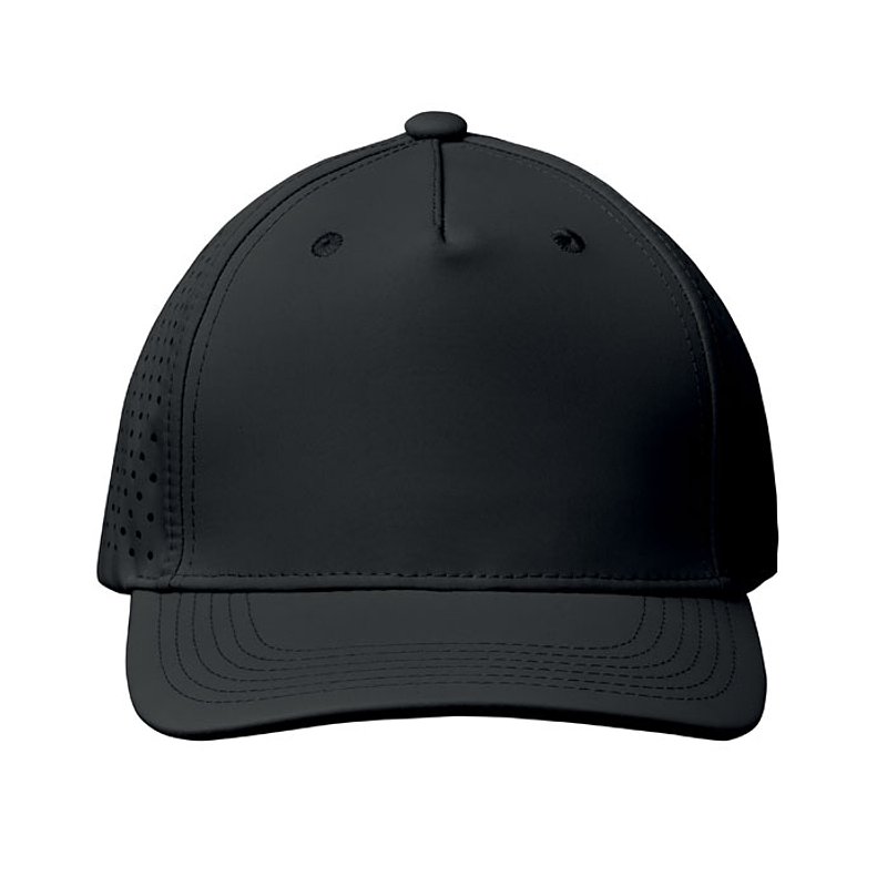 Gorra de poliéster 5 paneles con cierre de velcro ajustable y agujeros de ventilación. Con 2 ojales cosidos a juego. El artículo es de secado rápido, repelente al sudor y al agua. 130 gr/m².