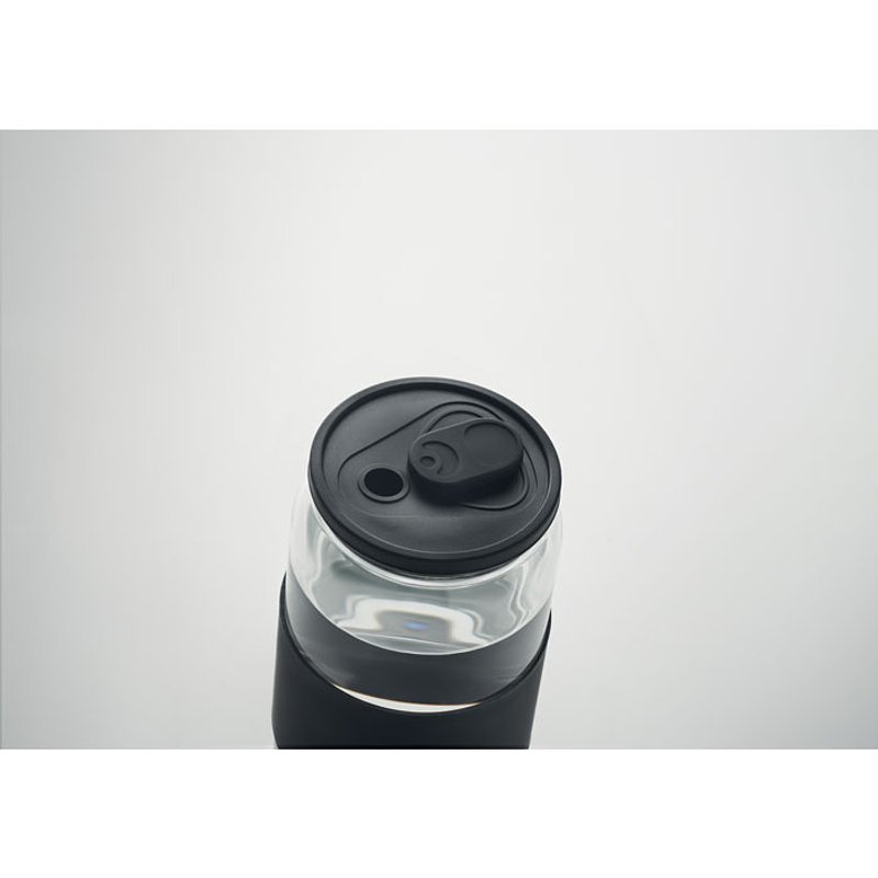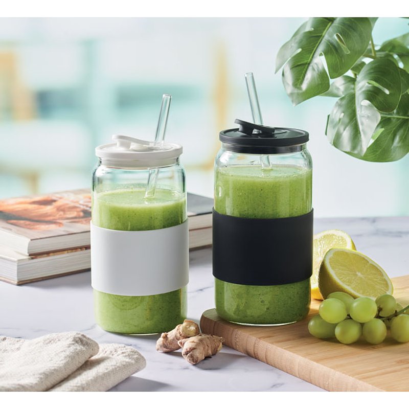 Vaso alto de vidrio borosilicato con tapa y banda de silicona. Incluye pajita de vidrio borosilicato. Capacidad : 550 ml.