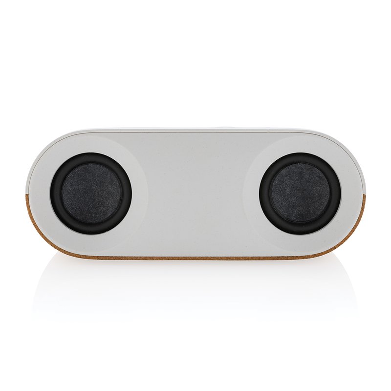 Altavoz inalámbrico de 10W fabricado con FSC® 100% corcho y ABS reciclado certificado RCS (Recycled Claim Standard). Contenido reciclado total: 25% basado en el peso total del artículo. La certificación RCS garantiza una cadena de suministro completamente certificada de los materiales reciclados. El altavoz está equipado con una batería de 1200 mAh para garantizar hasta 10 horas de tiempo de reproducción y BT5.3 para una conexión fluida y un sonido claro. Rango de conexión de hasta 10 metros. Con micrófono y función de descolgar para contestar llamadas. Presentado en caja FSC mix FSC®. Incluye cable de carga de TPE reciclado certificado por RCS. Artículo y accesorios 100% libres de PVC.