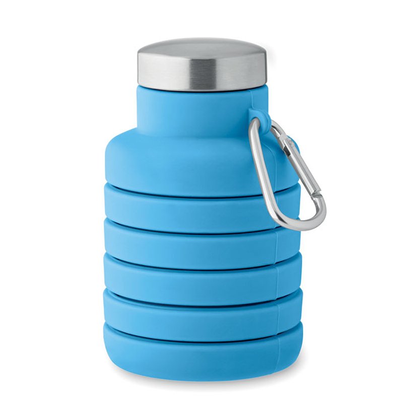 Botella plegable de silicona con tapa de acero inoxidable y mosquetón de aluminio. El mosquetón no es para escalada (uso no profesional). Capacidad: 500 ml.