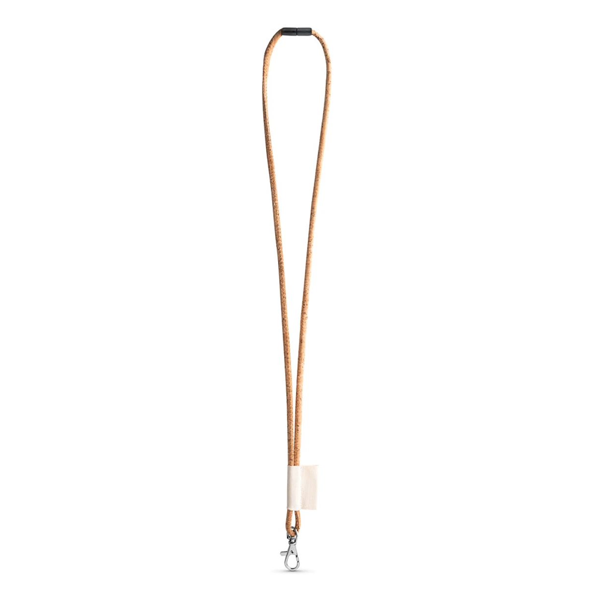Lanyard personalizado Lanyard en corcho. Lanyard Cork Long complementado con los siguientes accesorios y extras: etiqueta de algodón de 43 x 15 mm; Mosquetón de 9 mm y cierre de seguridad. ø5 x 470 mm