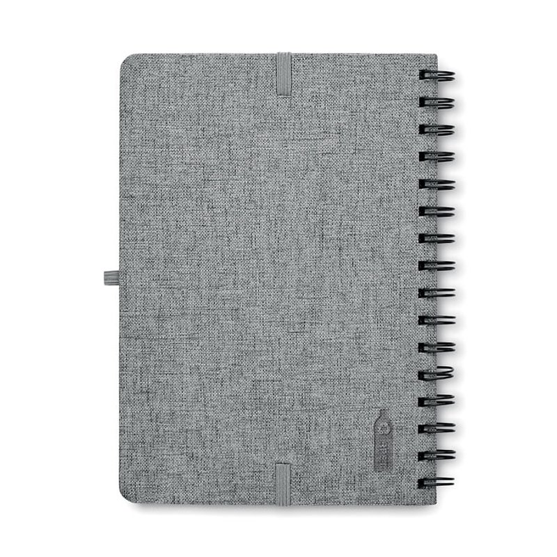 Libreta A5 de anillas con tapa dura de RPET 600D con función de soporte para smartphone. Doble hilo. 160 páginas rayadas (80 hojas). papel reciclado de 70 g/m². Banda elástica de cierre.