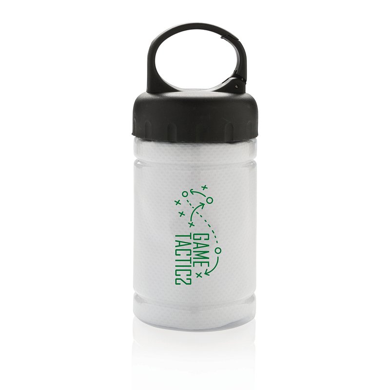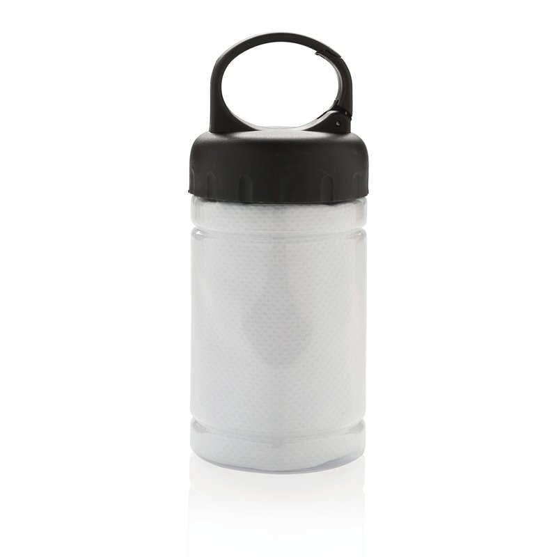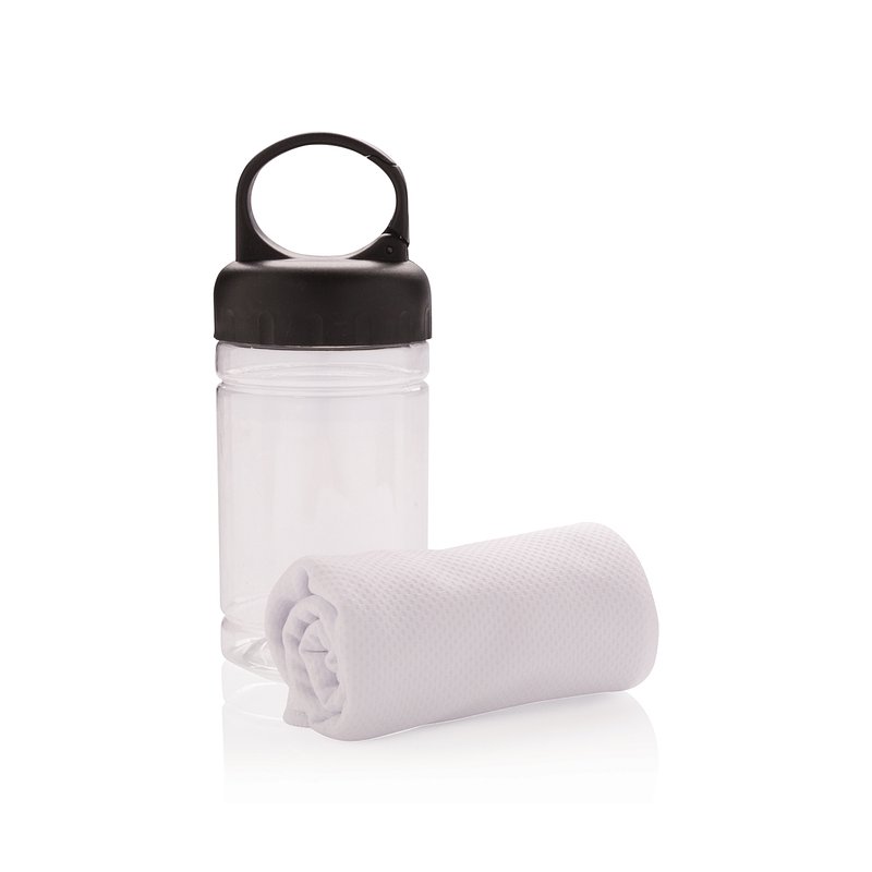 Serviette rafraîchissante en microfibres 100 % sans produits chimiques. Bloque 98 % du soleil jusqu'à une protection solaire UV 50+. La serviette peut être utilisée facilement en ajoutant de l'eau froide à la bouteille pour se rafraîchir rapidement. La bouteille est en PP et le haut en ABS. Elle inclut un mousqueton pour que vous puissiez l'accrocher lors de vos activités en plein air. 77 x 30 cm.