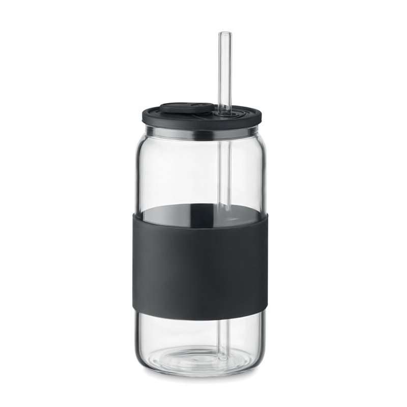 Vaso alto de vidrio borosilicato con tapa y banda de silicona. Incluye pajita de vidrio borosilicato. Capacidad : 550 ml.