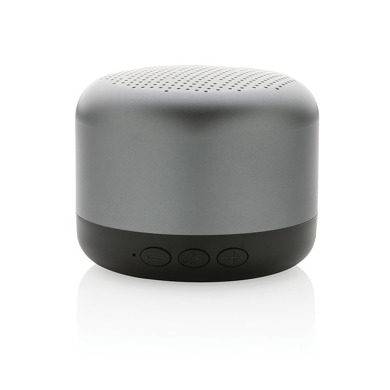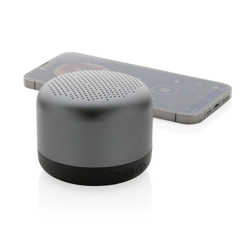 Altavoz inalámbrico de 5W fabricado con aluminio reciclado certificado RCS (Recycled Claim Standard) y ABS. Contenido reciclado total: 35% basado en el peso total del artículo. La certificación RCS garantiza una cadena de suministro completamente certificada de los materiales reciclados. El aluminio no pierde sus características en el proceso de reciclaje y puede reciclarse infinitamente. Incluye cable de carga tipo C reciclado fabricado con aluminio reciclado certificado RCS, TPE y PET. Presentado en envase mixto FSC®. La batería de 600 mah permite un tiempo de reproducción de hasta 4 horas y se puede recargar por completo en 2 horas. Con BT 5.0 para una conexión fluida hasta 10 metros.