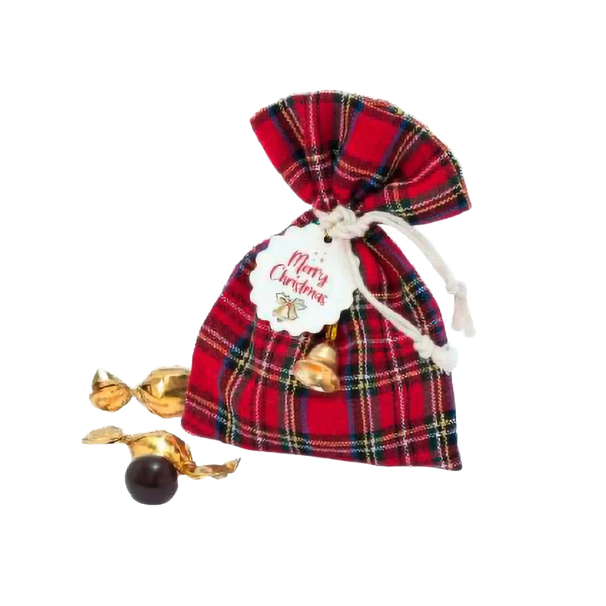 Bolsa escocesa con campanita y tarjeta de felicitación. Contiene 3 deliciosos bombones con centro de crocanti. Medida bolsita 10x12x3 cm.