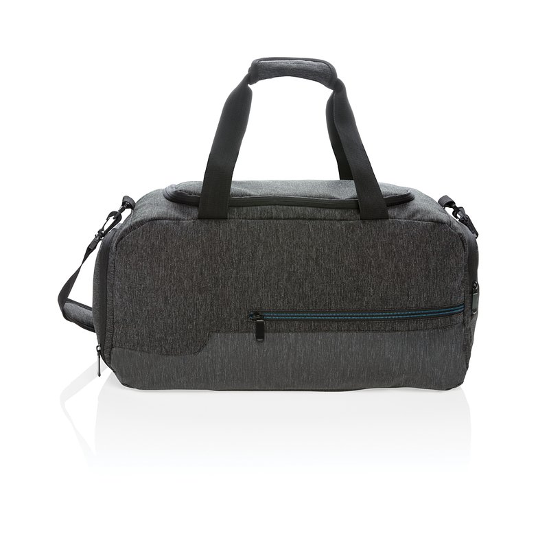 This 900D sports bag is perfect for any adventure or for going to the gym. It is made of durable polyester and its material is splash-resistant to protect it from wet surfaces. It has a main compartment with an inner pocket for storing valuables, a ventilated pocket for shoes, a front zip pocket, and padded handles for comfortable use. PVC-free.