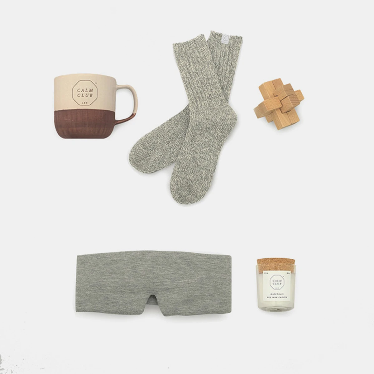 Spend a night of complete rest and relaxation. - A cup. - A pair of wool socks. - A puzzle. - A gel eye mask. - A soy candle.