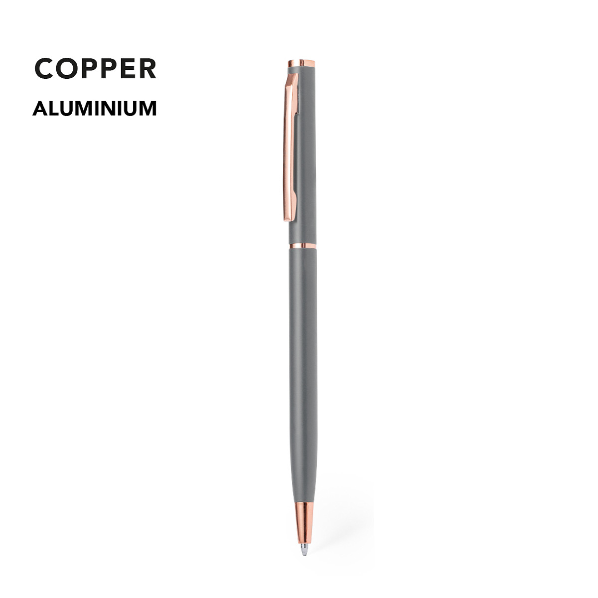 Excellent aluminum pen with twist mechanism. Body made of durable matte aluminum with decorative elements in an elegant copper finish, with the shaft in a wide range of distinctive colors. Metallic clip and blue ink. Presented in a recycled individual bag.