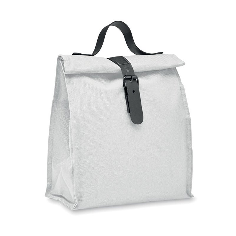 Bolsa nevera rolltop aislante de poliéster RPET 600D con asa y cierre de PU. Aislamiento: espuma PE de 3 mm con PEVA.