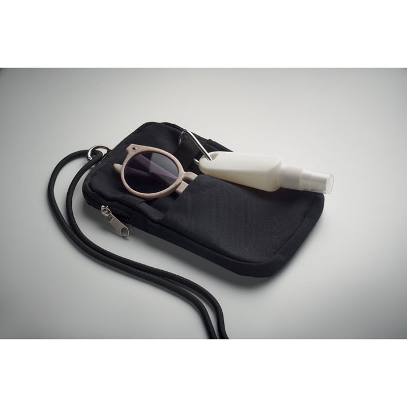 Bolsa bandolera para smartphone de algodón reciclado con cordón ajustable de poliéster RPET y bolsillo abierto en la parte delantera. 280 gr/m².