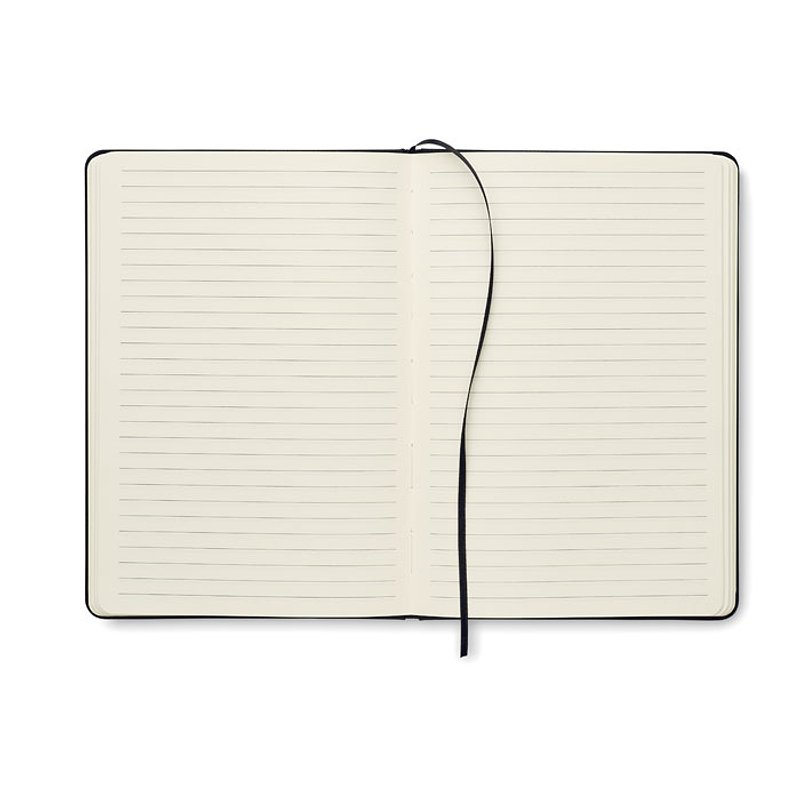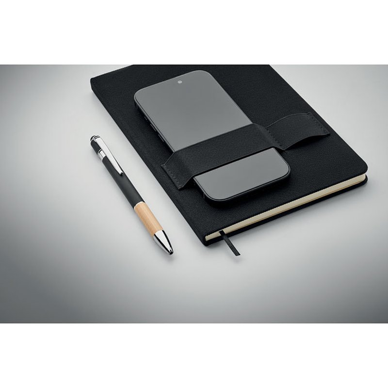 Set de libreta A5 con tapa dura de RPET 600D y bolígrafo de aluminio de tinta azul con agarre de bambú. Banda elástica frontal soporte para teléfono y para bolígrafo. Presentado en caja. 160 páginas rayadas de papel reciclado (80 hojas). Incluye marcapáginas y banda elástica.