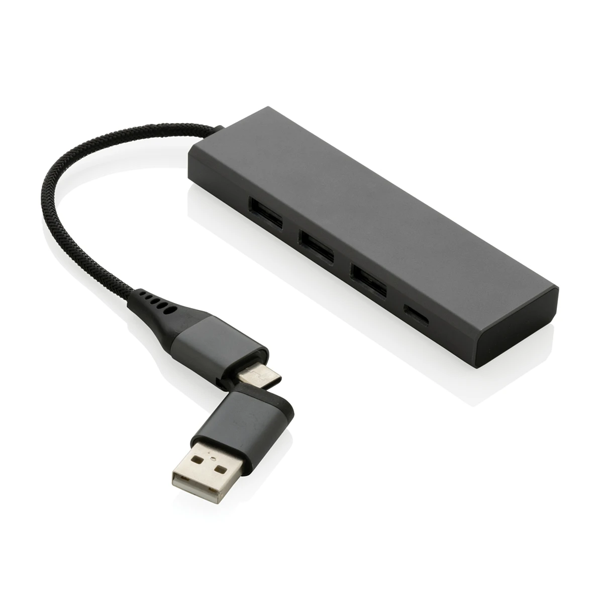 USB Hub made from RCS (Recycled Claim Standard) certified recycled aluminum, ABS, TPE, and PET. With 3 USB A 2.0 ports and 1 Type C port. The HUB has a built-in 10 cm cable made of RCS certified recycled TPE/PET material. Total recycled content: 75% based on the total weight of the item. The RCS certification ensures a fully certified supply chain of recycled materials. With dual input connector, making it suitable for both Type C and USB A computers. Aluminum does not lose its properties in the recycling process and can be recycled infinitely. Item and accessories 100% PVC-free. Presented in mixed FSC packaging. Allows data transfer.