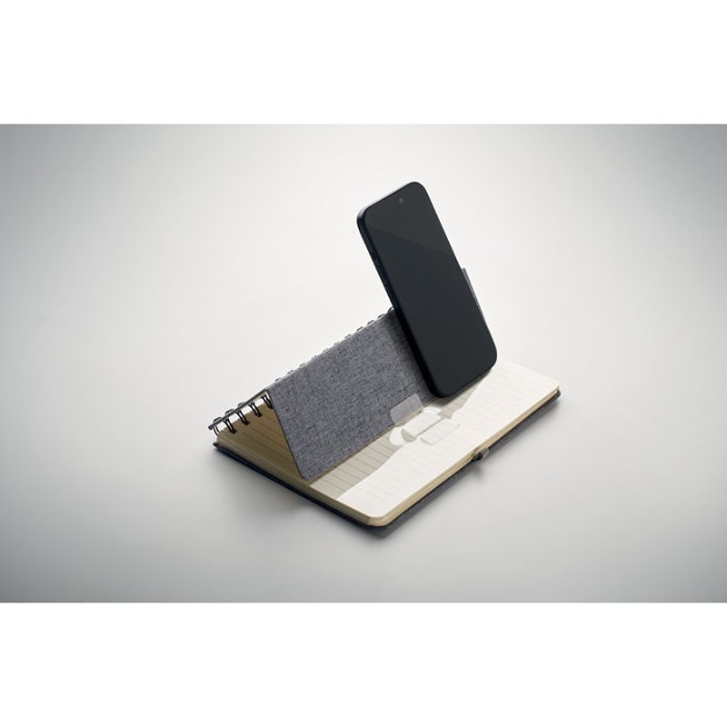 Libreta A5 de anillas con tapa dura de RPET 600D con función de soporte para smartphone. Doble hilo. 160 páginas rayadas (80 hojas). papel reciclado de 70 g/m². Banda elástica de cierre.