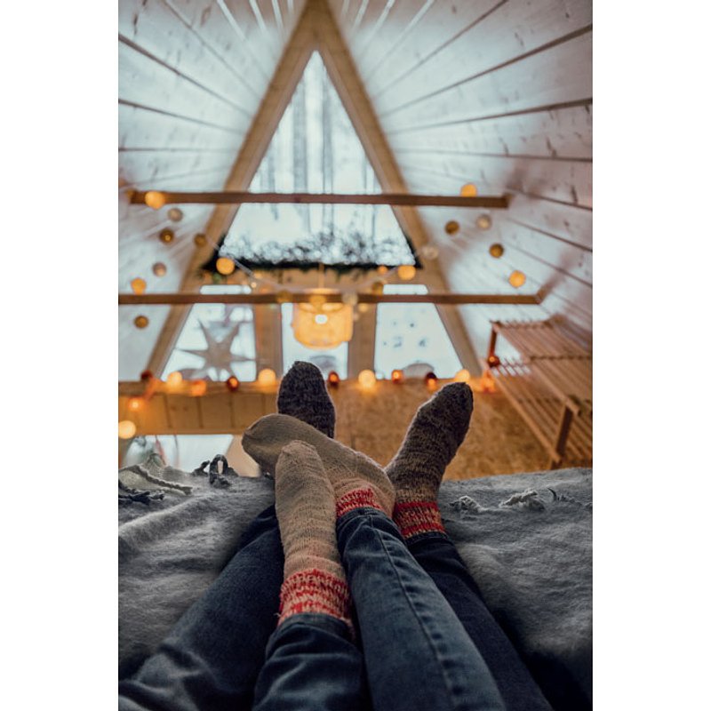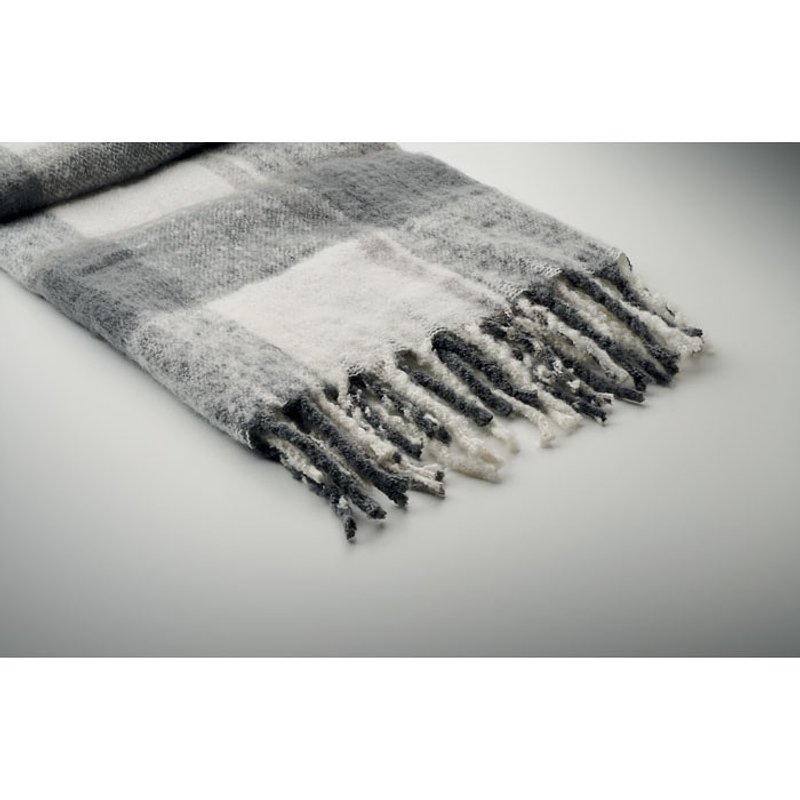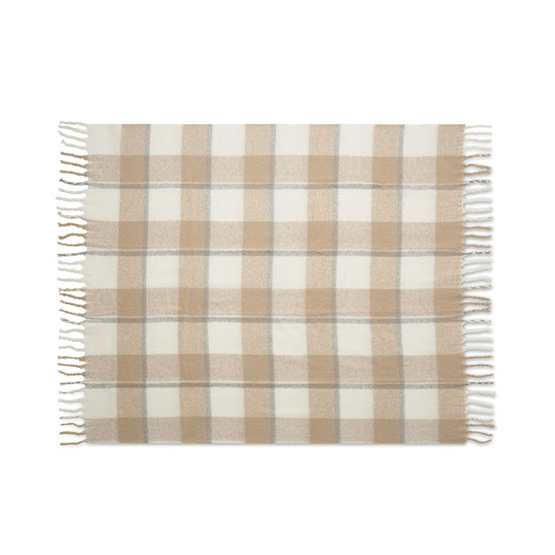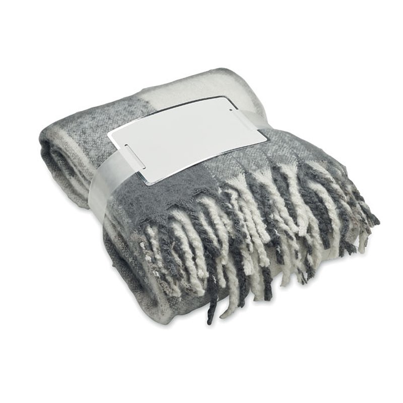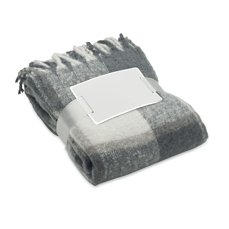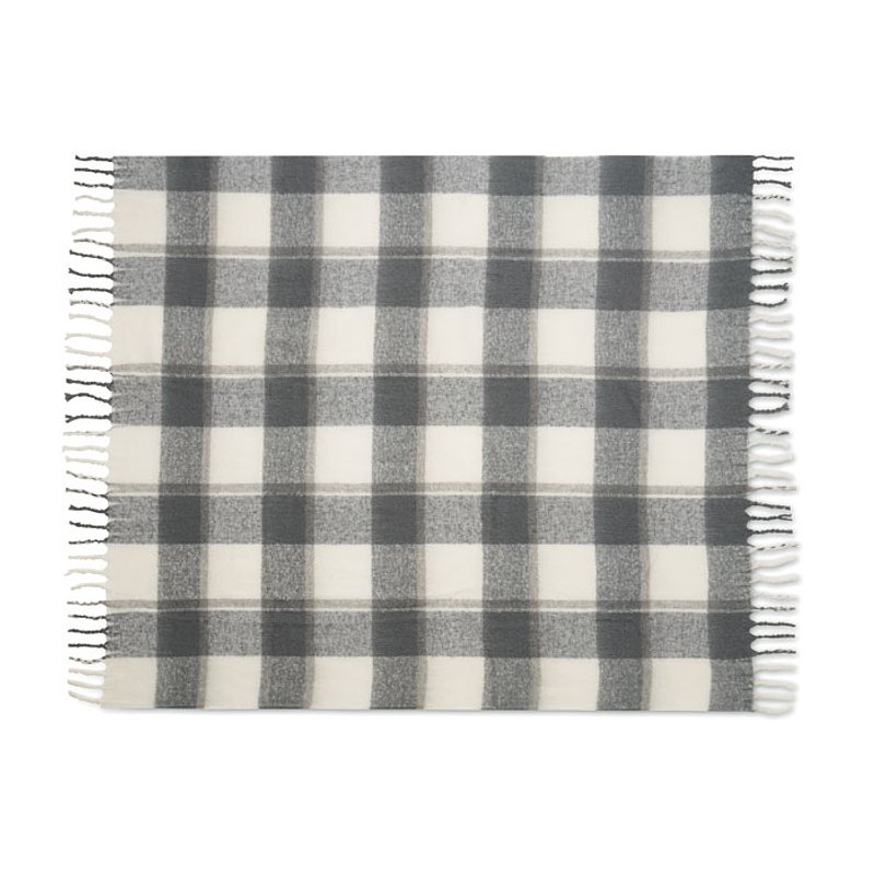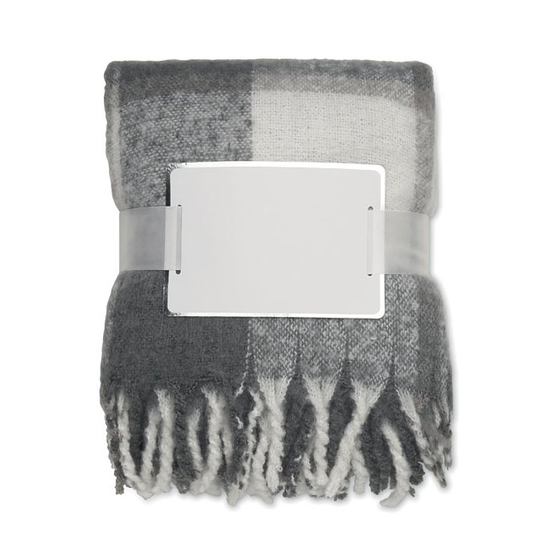 Manta de poliéster RPET mohair con diseño a cuadros y flecos enrollados a mano. Envuelta en cinta y tarjeta imprimible.