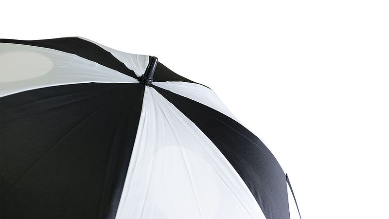 8-panel Golf Umbrella with a sober two-tone design and 135cm in diameter with manual opening. Made of sturdy pongee material with a windproof safety system. With black fiber rods, double velcro closure, and a soft padded foam handle. Presented in a case of the same material in an elegant black color.
