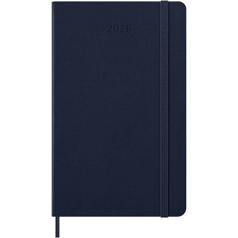 Fechada de enero a diciembre de 2026, la agenda semanal para 12 meses de tapa dura "Moleskine" muestra toda la semana de un vistazo, al tiempo que ofrece páginas con vista anual y mensual para una visión más amplia del año, seguidas de páginas para planificar viajes, ideas y objetivos. Los días de cada semana se muestran en una cara, mientras que la opuesta es una página rayada para tareas y notas. Incluye papel color marfil libre de ácidos, un cierre elástico negro, un marcapáginas de cinta, un bolsillo interior extensible de color a conjunto y adhesivos para la personalización, así como adhesivos del año para el lomo. Medidas: 13,4 x 21,2 x 1 cm