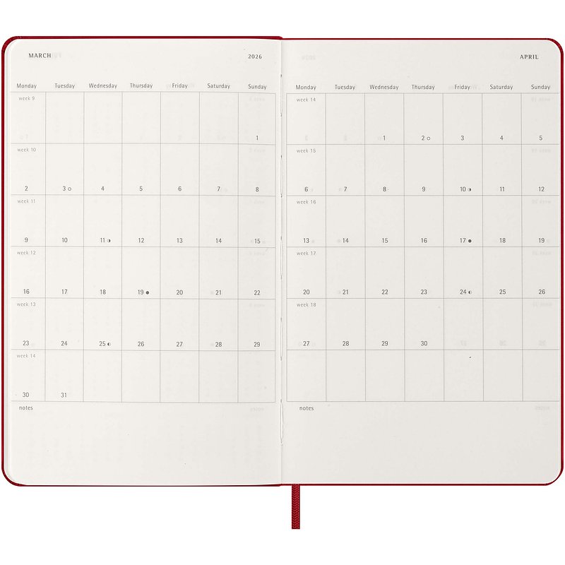 Fechada de enero a diciembre de 2026, la agenda semanal para 12 meses de tapa dura "Moleskine" muestra toda la semana de un vistazo, al tiempo que ofrece páginas con vista anual y mensual para una visión más amplia del año, seguidas de páginas para planificar viajes, ideas y objetivos. Los días de cada semana se muestran en una cara, mientras que la opuesta es una página rayada para tareas y notas. Incluye papel color marfil libre de ácidos, un cierre elástico negro, un marcapáginas de cinta, un bolsillo interior extensible de color a conjunto y adhesivos para la personalización, así como adhesivos del año para el lomo. Medidas: 13,4 x 21,2 x 1 cm