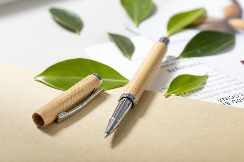 Roller hood pen in nature line. Made of bamboo, with a soft finish and chrome accessories. Jumbo cartridge, with blue ink.