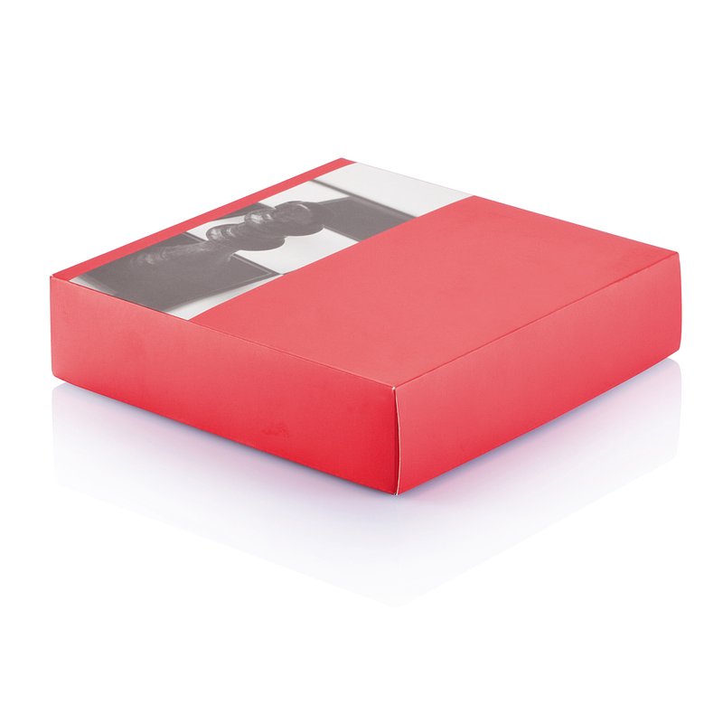 5 in 1 game set includes: mikado, cards, dominoes, chess and backgammon. Pine wood white box 17x17x3.7cm with chess board on one side and red and black backgammon board on the bottom of the box. One side of the sliding lid is suitable for logo printing. Presented in a black box with a red lid and red interior mat.