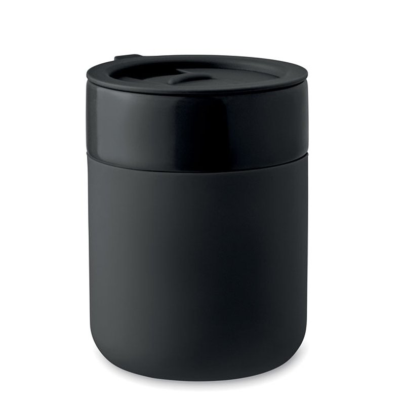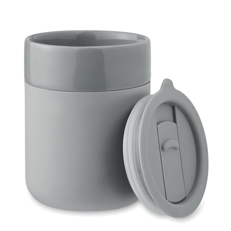 Vaso de cerámica con funda de silicona y tapa de PP. Capacidad: 330 ml.