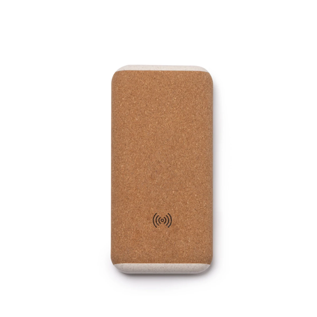 Batería externa con cuerpo de corcho y fibra de trigo. Capacidad 10.000 mAh. Función de recarga de dispositivos mediante carga inalámbrica de 15W. Con indicador luminoso de carga. Puerto Tipo C de entrada y salida y puerto USB salida. Incluye cable Tipo C.