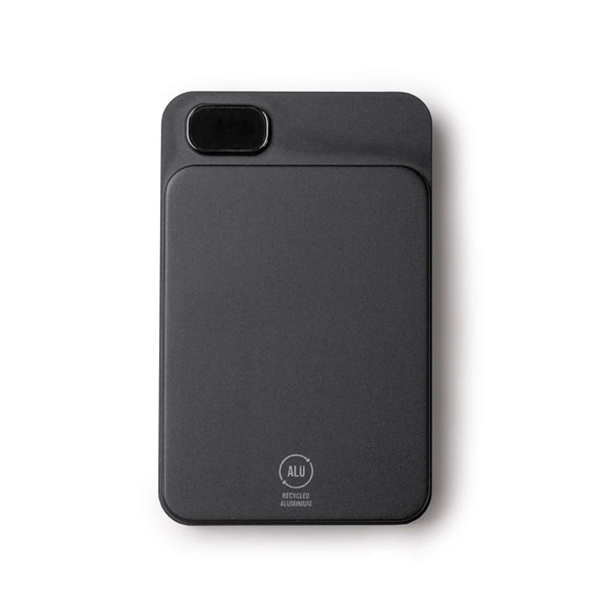 Batería externa magnética de 10000 mAh con cuerpo de aluminio reciclado. Con función de carga inalámbrica para dispositivos provistos de esta tecnología. Pantalla LED con indicador de porcentaje de carga. Puerto Tipo C de entrada y salida. Salida corriente 15W. Incluye cable tipo C y anillo magnético.