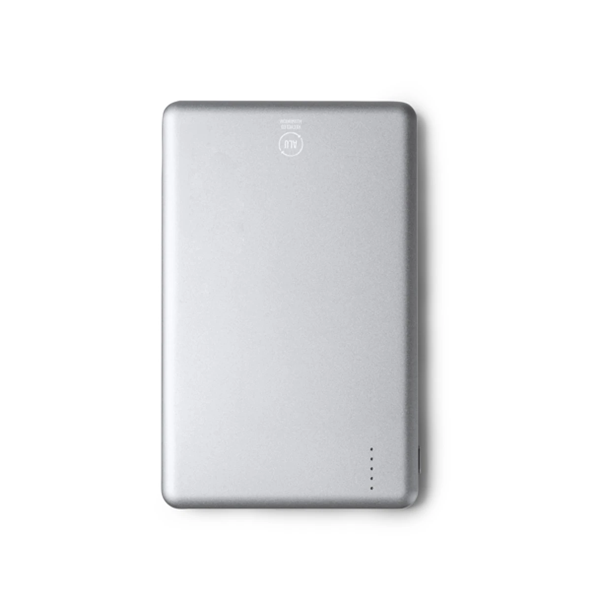 Batería externa magnética de 5000 mAh, elaborada en de aluminio reciclado. Con función de carga inalámbrica para dispositivos provistos de esta tecnología. Salida corriente inalámbrica de hasta 15W para Android y 7.5W para IOS. Cuenta con indicador luminoso de carga. Incluye cable tipo C y anillo magnético universal.