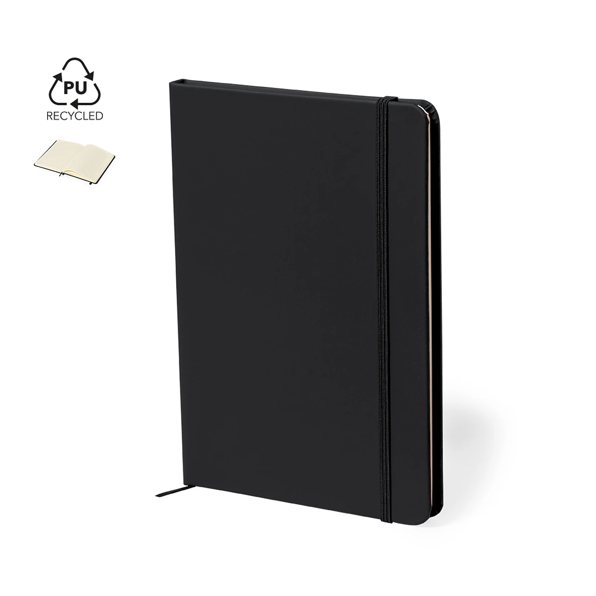 Bloc de notas con tapas rígidas fabricadas en polipiel reciclada en distintos colores. Interior con 100 hojas de disposición a una raya. Incluye elástico de cierre del mismo color. Con distintivo Polipiel Reciclada. Presentado en bolsa individual reciclada.La polipiel destaca por su resistencia y elasticidad. Este material reciclado y reciclable es una opción sostenible que rescata las fibras desechadas en los procesos de fabricación, minimizando así el desperdicio de material y contribuyendo a su vez a reducir el impacto ambiental, manteniendo a la vez sus propiedades originales.