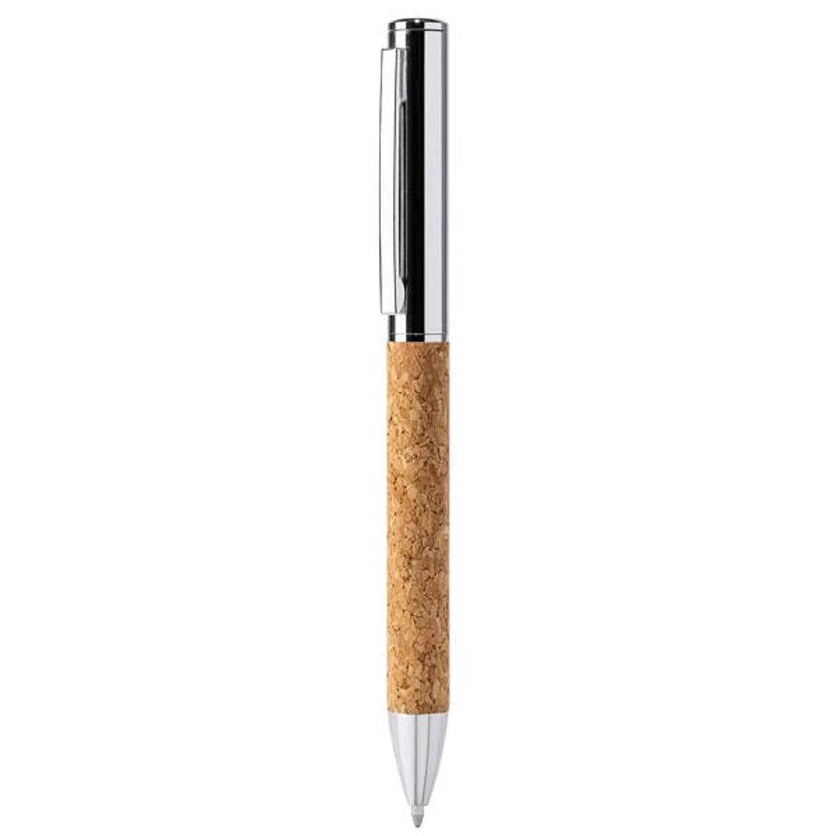 Elegante bolígrafo metálico con acabado cromado y empuñadura de corcho. Carga jumbo metálica de tinta azul. Presentación en caja elaborada en corcho.