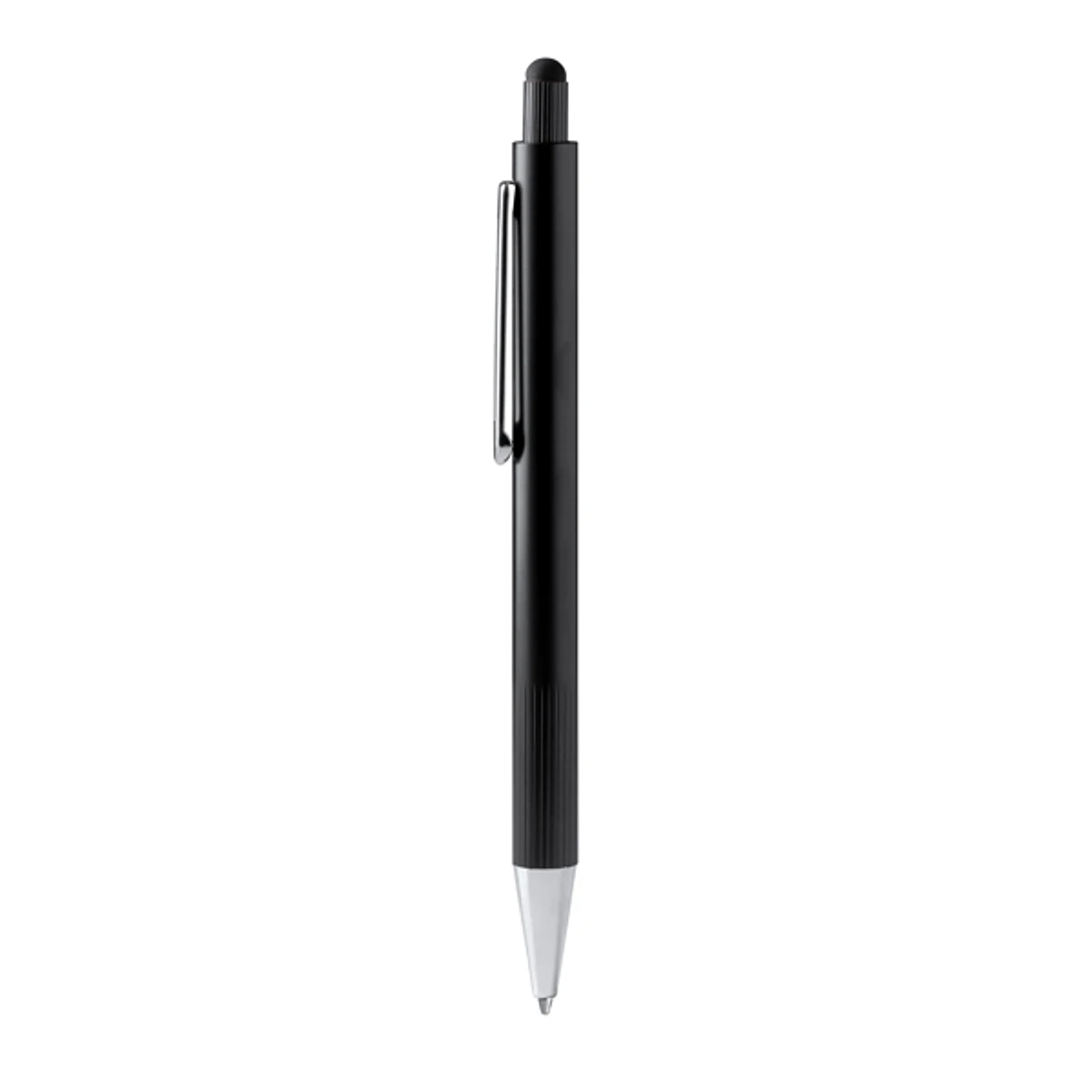 Bolígrafo de aluminio con agarre rayado en acabo metálico y puntero táctil. Detalles texturizados en empuñadura y pulsador. Carga jumbo de tinta azul.