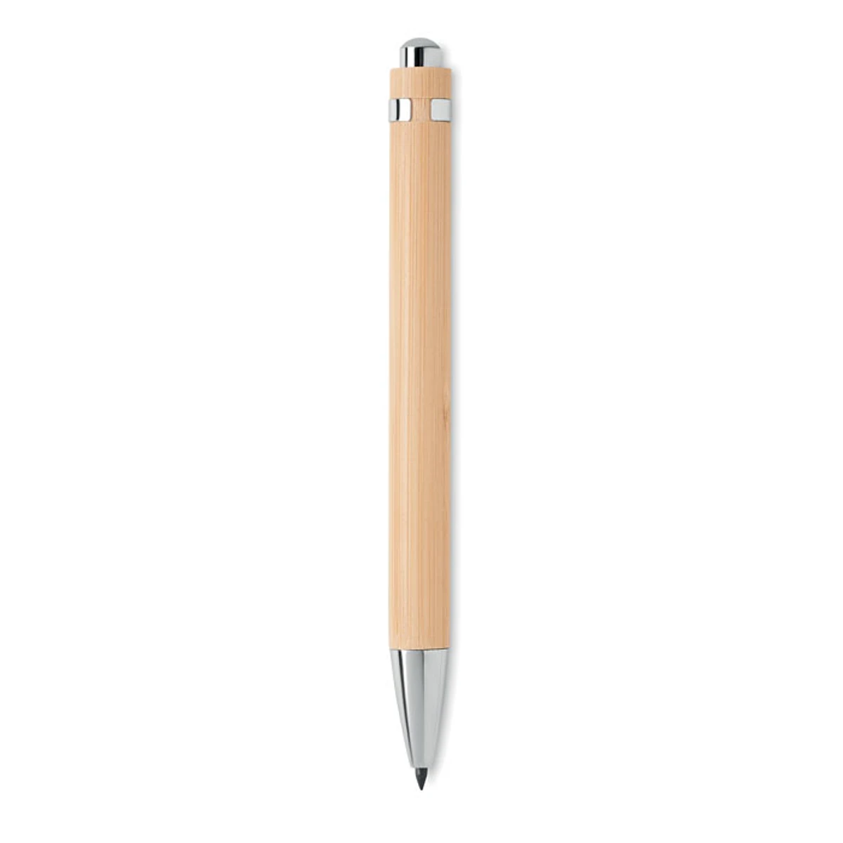 Bolígrafo sin tinta con pulsador y cuerpo de bambú con accesorios cromados brillantes. Bolígrafo con punta de aleación de metal y a medida que escribes, oxida el papel sin dejar ningún residuo. El bambú es material natural, el color del articulo puede variar.