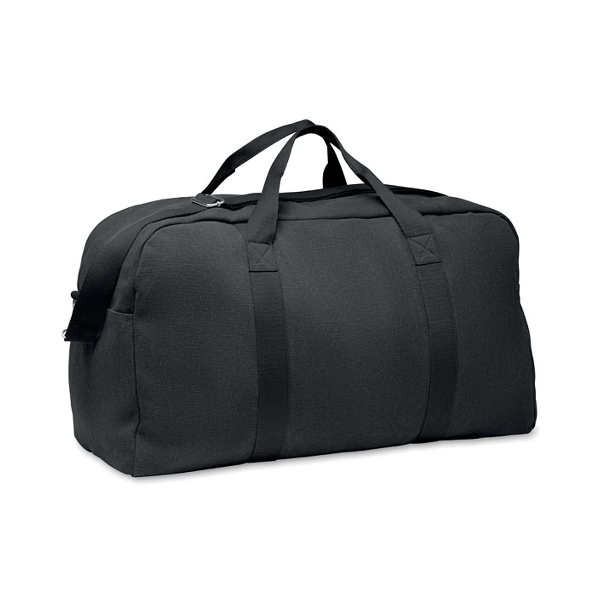 Bolsa de viaje en tejido reciclado de 450 gr/m² (60% algodón reciclado y 40% poliéster reciclado) con correa de algodón ajustable y desmontable.