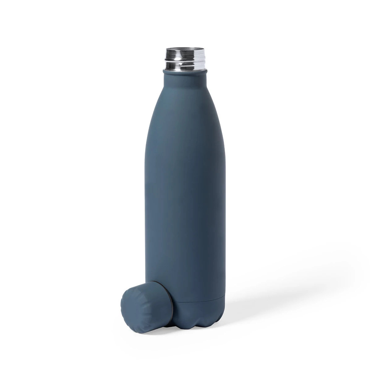 Bidón de 790 ml de capacidad, fabricado en acero inox y acabado con tacto goma, especialmente diseñado para marcaje en láser. Con tapón a rosca a juego, libre de BPA y disponible en variada gama de colores mate. Presentado en caja individual de diseño kraft.