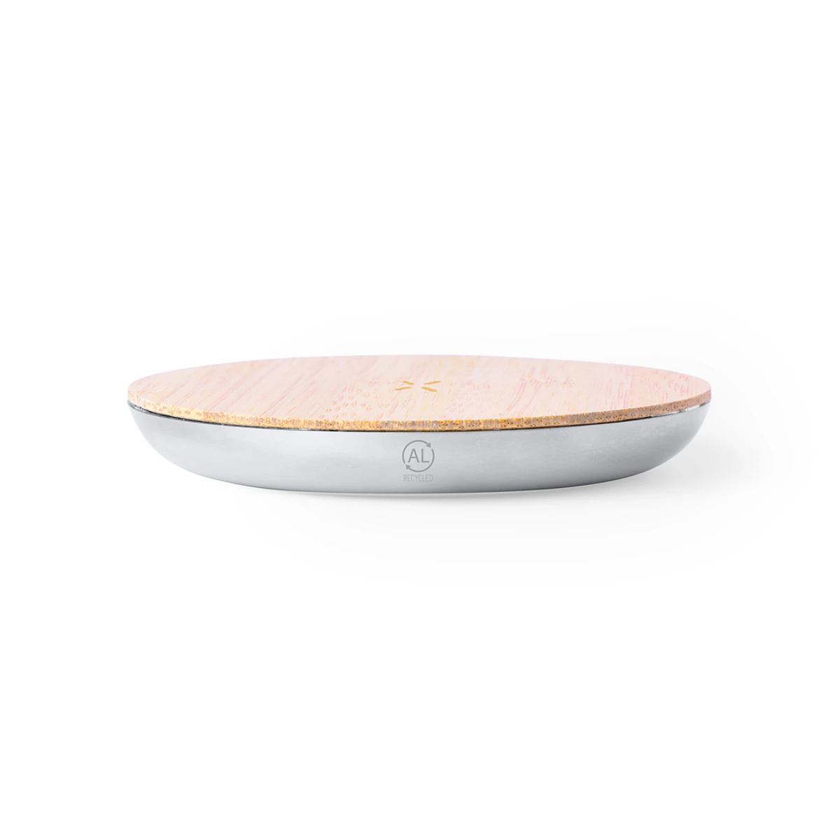 Cargador inalámbrico 15W de diseño circular, con cuerpo fabricado en Aluminio Reciclado y base de carga en bambú. Compatible con dispositivos equipados con tecnología de carga inalámbrica Qi, con cable de carga Tipo C incluido e indicador LED de estado de carga. Base antideslizante y presentado en caja individual de diseño kraft, con manual de instrucciones en español e inglés.Materiales como el bambú fomentan la utilización de materias primas naturales, reduciendo las emisiones contaminantes. Proviene de una planta de gran resistencia y versatilidad, con crecimiento y regeneración rápidos, siendo una excelente alternativa al uso de madera tradicional.El Aluminio Reciclado es un material con posibilidades de reciclaje casi infinitas, sin perder sus propiedades originales y consumiendo menos energía en este proceso.Certificación GRS (Global Recycled Standard / Estándar de Reciclaje Global), que garantiza el origen reciclado del material usado para fabricar el producto.Fabricado conforme a los estándares RoHS y en cumplimiento con los siguientes requisitos de seguridad:Sistema de protección contra sobrecalentamiento.Sistema de protección contra sobrecarga.Sistema de bloqueo para evitar cortocircuitos.