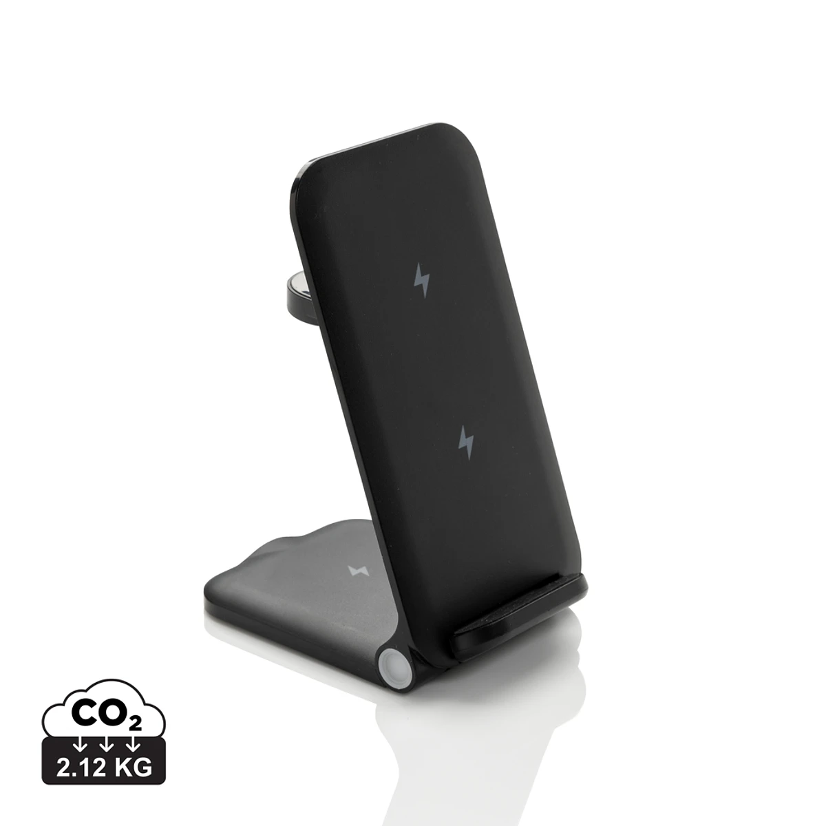 Cargador inalámbrico 3 en 1 fabricado con ABS reciclado RCS. Contenido reciclado total: 51% en base al peso total del artículo. La certificación RCS garantiza una cadena de suministro completamente certificada de los materiales reciclados. Equipado con un cargador inalámbrico de 15W y otro adicional de 5W adecuado para estuches de auriculares u otros dispositivos pequeños de carga inalámbrica. Cargador inalámbrico de 2,5 W para relojes inteligentes (solo relojes Apple). Diseño plegable para que sea fácil de llevar contigo. Incluye cable de TPE reciclado de 120 cm con certificación RCS. Presentado en embalaje de papel kraft mixto FSC®. Artículo y accesorios 100% libres de PVC. Entrada: 9 V/3 A para un uso óptimo. Salida: Teléfono: 9 V/1,1 A; 9 V/1,67 A/(15W), Auriculares: 5 V/1 A (5W), Reloj: 5 V/0,5 A.