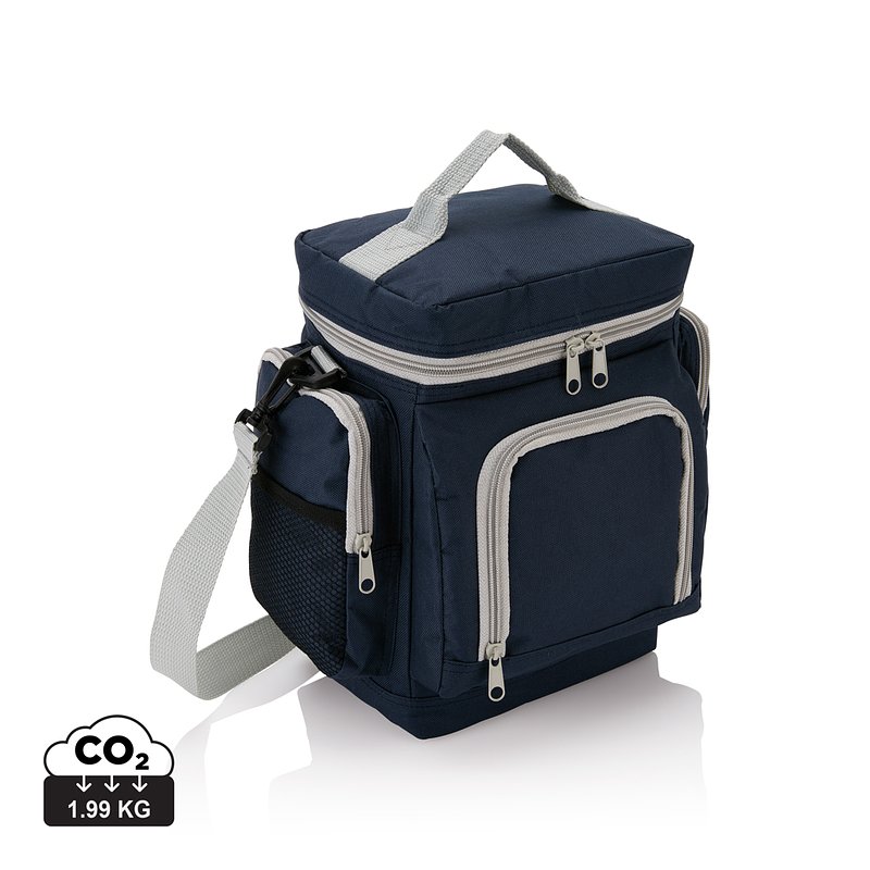 Nevera de poliéster 600D con múltiples apartados y correa para hombro ajustable. sin PVC.