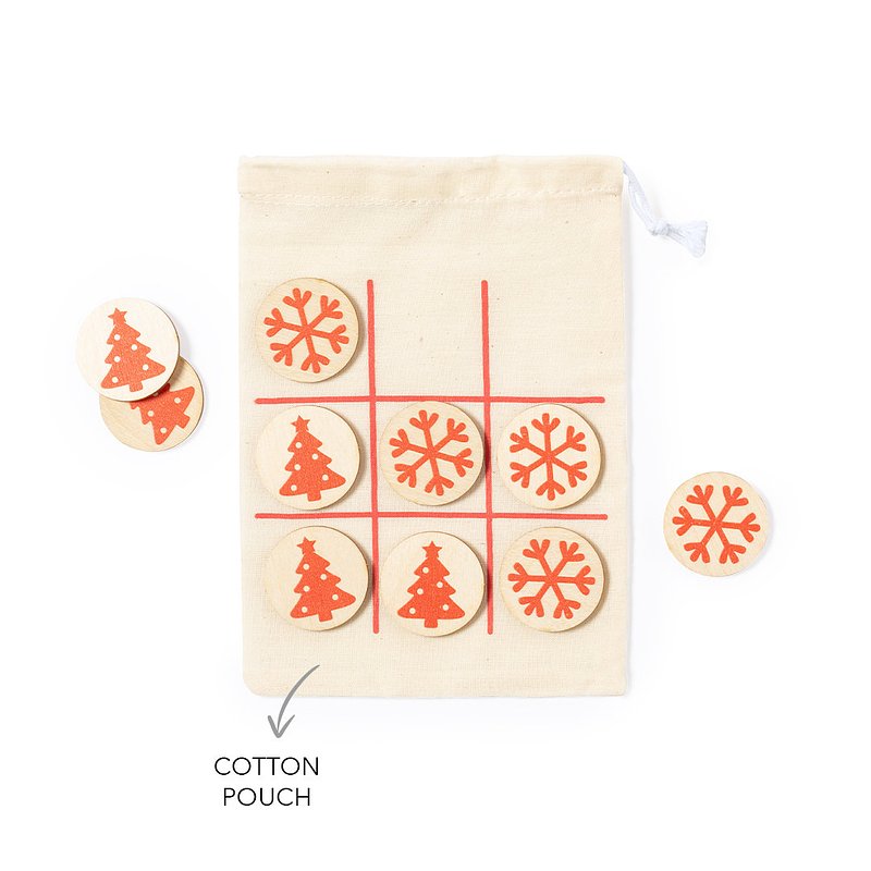 Juego tres en raya de original diseño navideño y fabricado en madera natural. Presentado el bolsa con cierre de cordón, incluidas 5 fichas copo de nieve y 5 fichas árbol de navidad.