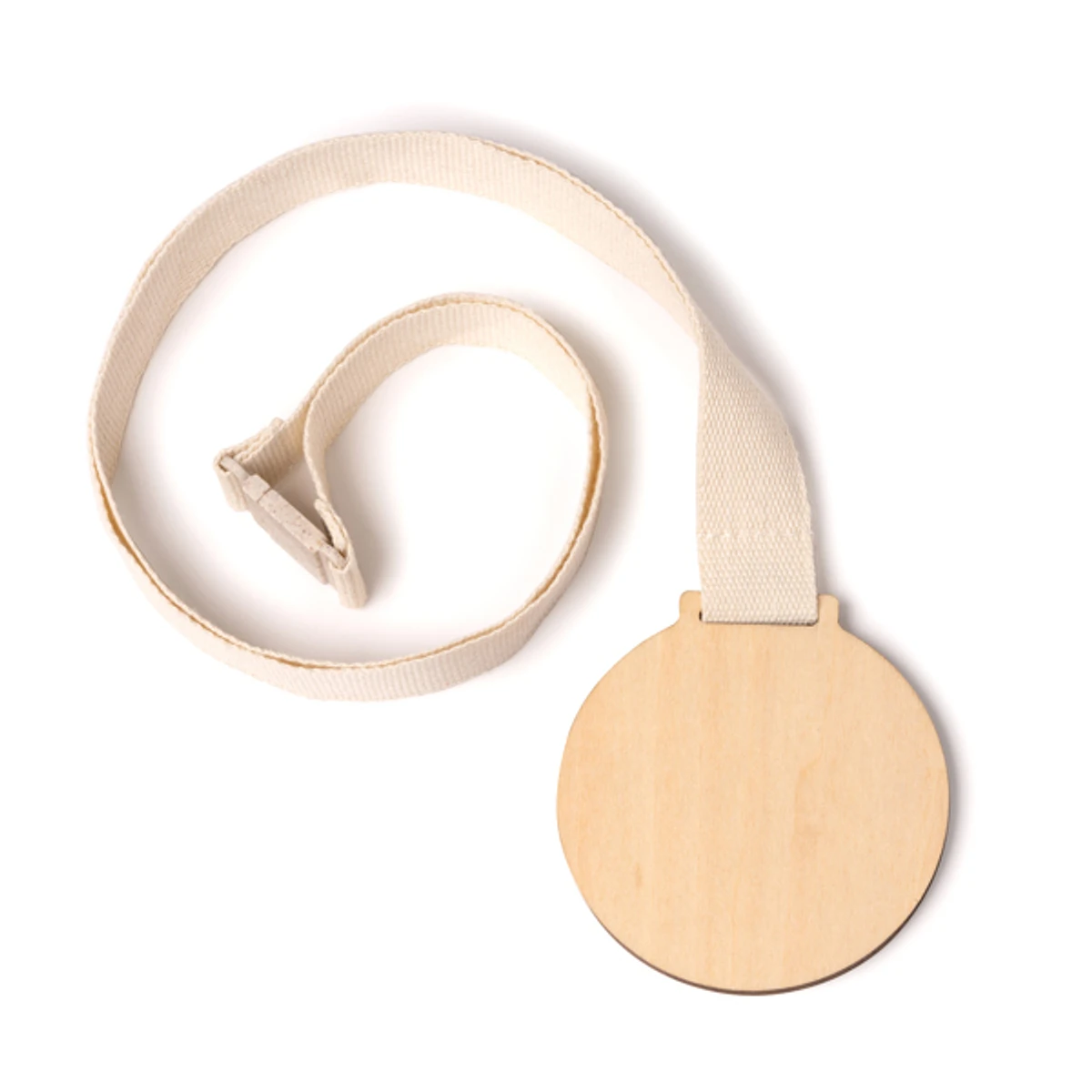 Medalla realizada en bambú con cordón de algodón. Incluye cierre de seguridad elaborado en fibra de trigo en el extremo.