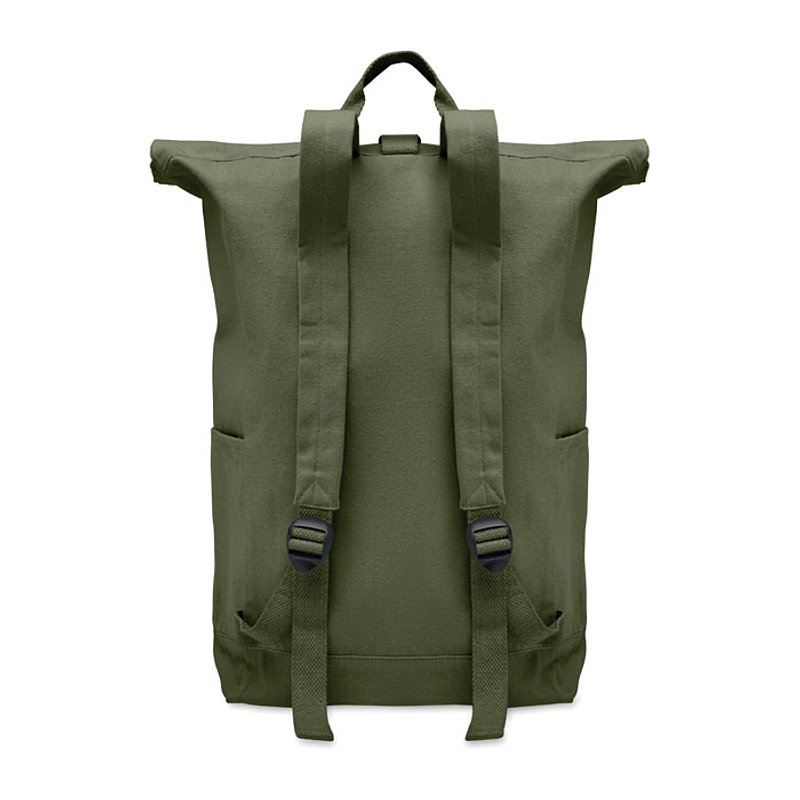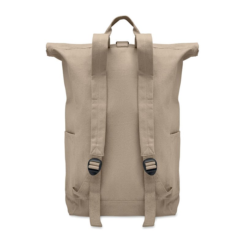 Mochila con cierre roll top autoadherente en algodón reciclado de 390 gr/m² (80%) y poliéster reciclado (20%). Bolsillo delantero con cremallera.