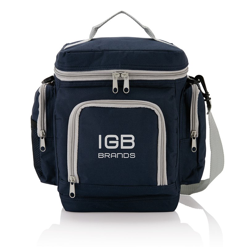 Nevera de poliéster 600D con múltiples apartados y correa para hombro ajustable. sin PVC.