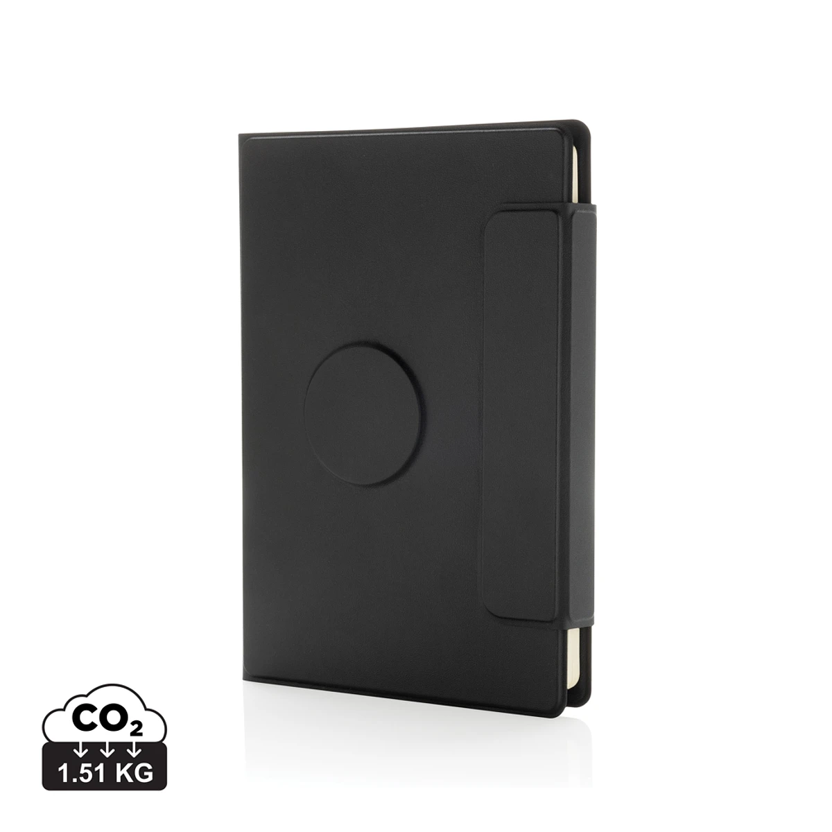 Portafolio A5 de poliéster reciclado PU con cierre magnético y soporte para teléfono compatible con iPhone 12 o superior con Magsafe. Libreta interior A5, páginas interiores con certificación FSC® y 64 hojas/128 páginas; papel color crema con líneas. Gramaje del papel 80 g/m², bolsillo para documentos y 2 ranuras para tarjetas de visita. Libreta recargable.