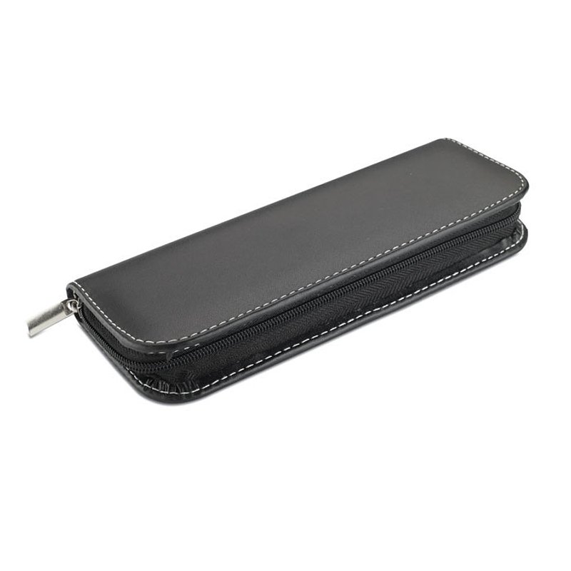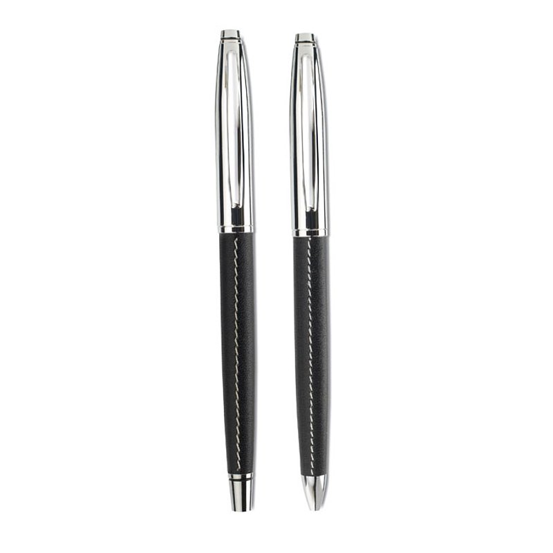 Set de bolígrafo con tinta azul y roller con tinta negra. Presentado en un estuche de PU con cremallera y pespuntes en contraste.